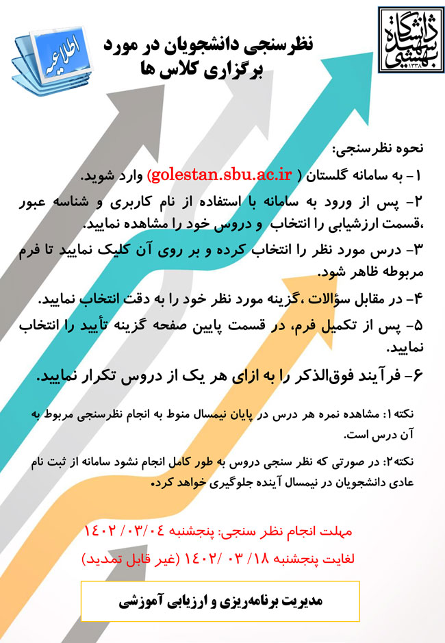 خاطر نشان می‌سازد مشاهده نمرات دروس نیم‌سال جاری و انتخاب واحد نیم‌سال بعد دانشجویان منوط به تکمیل فرم نظرسنجی دروس ترم جاری است.
