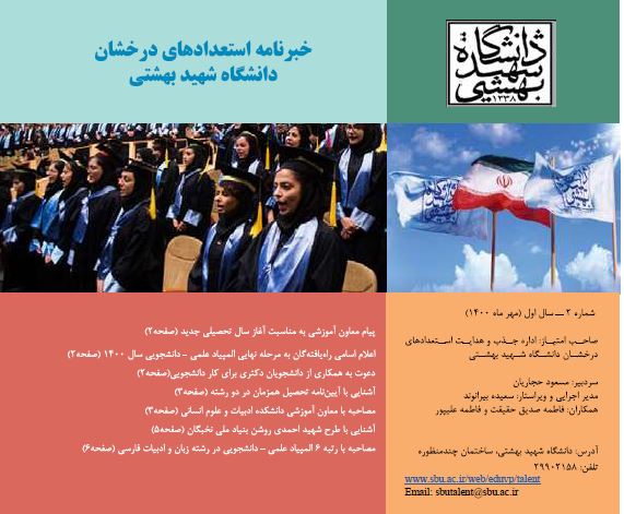 دومین شماره ماهنامه الکترونیکی «خبرنامه استعدادهای درخشان دانشگاه شهید بهشتی» ویژه مهر1400 منتشر شد.