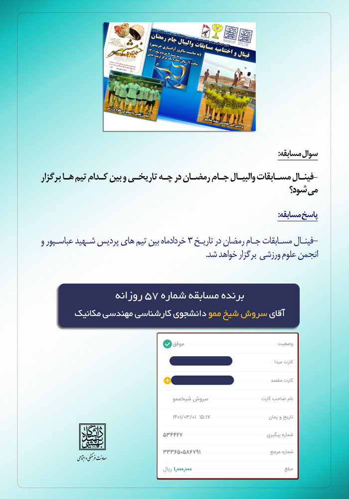 پاسخ مسابقه: فینال مسابقات جام رمضان در تاریخ ۳ خردادماه بین تیم های پردیس شهید عباسپور و انجمن علوم ورزشی برگزار خواهد شد.