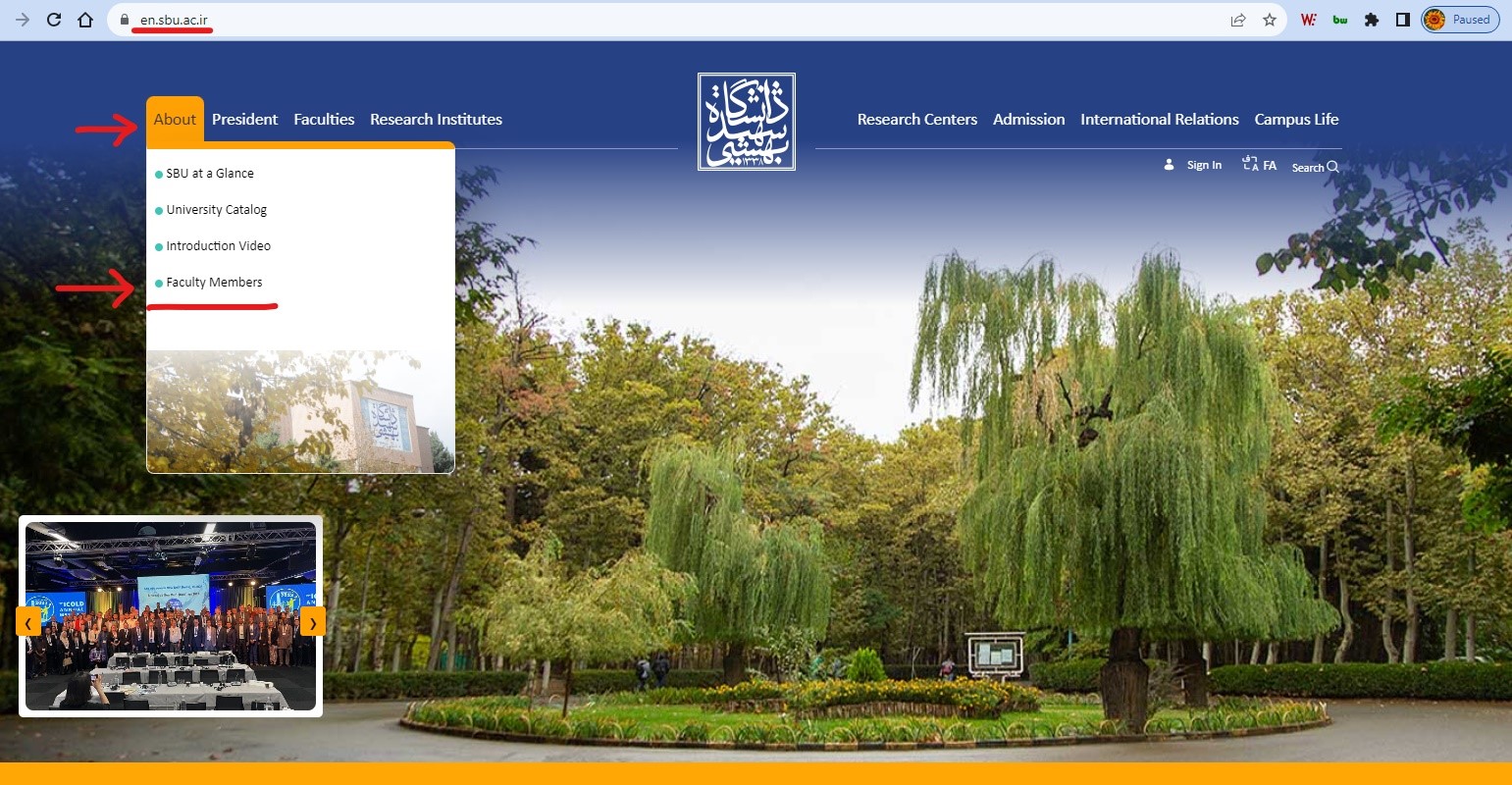 بهدنبال راهاندازی فهرست مجزای رزومههای انگلیسی اعضایهیات هر دانشکده یا پژوهشکده (مشاهده خبر)، «فهرست جامع رزومههای انگلیسی» نیز بر بستر وبگاه انگلیسی دانشگاه راهاندازی شد. این فهرست به آدرس https://en.sbu.ac.ir/cv در دسترس است. همچنین از طریق منوی About، گزینه Faculty Members در وبسایت انگلیسی دانشگاه به آدرس https://en.sbu.ac.ir/ (تصویر ذیل) نیز قابل دسترسی است. امکان جستجوی نام عضو هیاتعلمی، همچنین جداسازی بر حسب دانشکده یا پژوهشکده، و گروه آموزشی نیز در این فهرست وجود دارد. شایان ذکر است رزومههای انگلیسی اعضای هیاتعلمی دانشگاه، با بهرهگیری کامل از اطلاعات سامانه آموزشی و به صورت خودکار ساخته شده و بهصورت هفتگی بهروزرسانی میشوند.