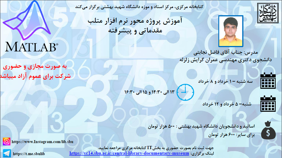 دوره آموزشی شانزده‌ساعته پروژه‌محور نرم‌افزار متلب در روزهای سه‌شنبه (1 خرداد و 8 خرداد) و شنبه (5 خرداد و 12 خرداد) از ساعت (13 تا 14:30 و 15 الی 16:30) به صورت حضوری و مجازی در محل سالن کنفرانس کتابخانه مرکزی، مرکز اسناد و موزه دانشگاه شهید بهشتی برگزار خواهد شد.